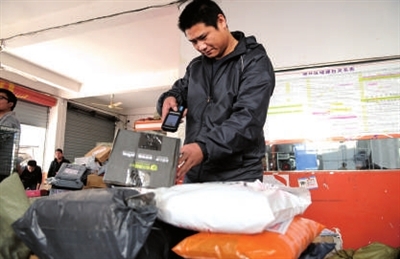 14日早上7点,一辆大货车卸下如山的包裹,几乎占满了整个仓库地面。吴金玉拿出终端,对包裹进行扫描、分类、装箱,装好满满一车包裹后,便骑着三轮车上路送快递。