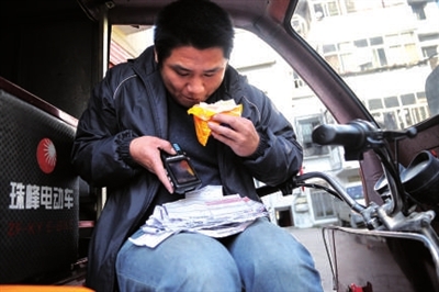 “有句行话说,快递员的早饭中午吃,午饭晚上吃,晚饭不知道什么时候吃。干这一行时间长了就习惯了。”吴金玉擦了擦额头上的汗,憨笑着说。“这几天就像春运一样,是派送快递的高峰期,今天就有200多个快递要送,所以得赶时间,不然累积到明天就会更多。”