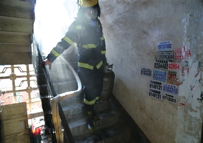 灭火组到达四楼后,猛烈的大火从防盗门中窜出,官兵们首先切断楼内外部总电闸,随后控制门外火势,用铁镐对防盗门进行破拆,两名消防官兵带两支水枪互相配合进入屋内进行灭火。而此时,消防官兵在厨房内发现两个液化气罐,形势十分严峻。消防官兵立即对其冷却,并将其转移至安全区域。