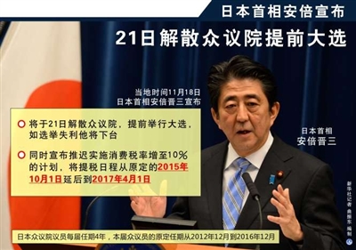 安倍表示,重大税收政策变化是关系到国民生活和国民经济的大事,因此推迟提高消费税需要“问信于民”,为此他决定在21日解散众议院,提前举行大选。