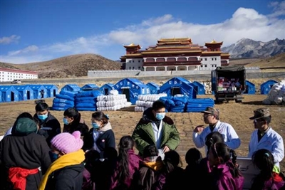 木雅祖庆学校是甘孜州康定县最大的一所学校,共有中小学生1828人,校舍受到严重损毁,所有学生在老师的陪同下,已在安全的空地上搭建起救灾帐篷。医护人员向有感冒病症的学生发放了药剂。