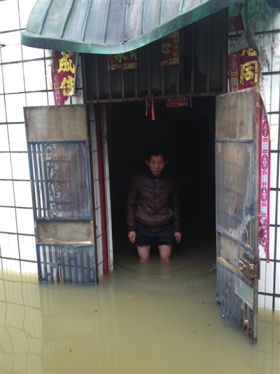 在蒋兴桂的邻居家,积水已经漫过大门半截,漫过成年人的膝盖,房内的摩托车也基本被淹没;另一户居民家,厕所里的蹲便器已被水淹没,无法使用。
