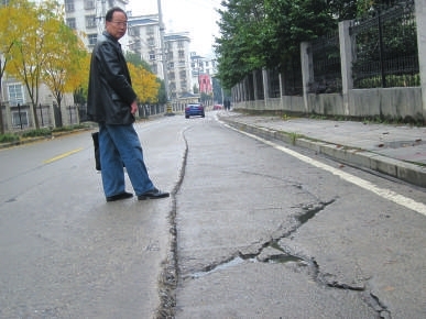 记者跟随李先生来到玉泉街与谭惠路交叉口看到,靠近人行道一侧的路面上有一处开裂,裂口两边落差有3至4厘米左右。