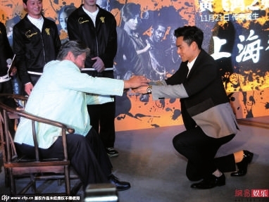 24日,洪金宝率多位洪家班弟子与彭于晏一同出席上海见面会,谈及对新版“黄飞鸿”的评价时,洪金宝大哥表示,给彭于晏打89分。“我从来没有见过一个年轻人像他一样能吃苦,从他的身上我看到了黄飞鸿那股执着的力量。”洪金宝作为影片的监制,在拍戏时对彭于晏的要求十分严格,“我对他要求高是因为我看好他,他任劳任怨,拍打戏从早打到晚,长得又帅,以后会比我厉害!”随即,他宣布收彭于晏为徒,将现场气氛推向极致。由此,整场见面会变成了“拜师大会”,彭于晏在奉茶、三叩首之后正式称呼洪金宝“师父”,随后再次叩首拜谢表示尊重,令现场观众感受到师徒之间的深厚情谊。