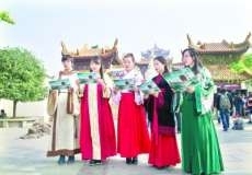 22日,黄鹤楼景区,来自武汉职业技术学院一群师生身穿汉服,在老师的带领下齐声诵读“黄鹤文明谣”,吸引了不少市民驻足观看。 (湖北教育新闻网)
