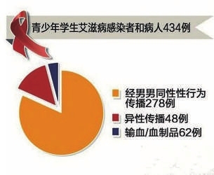 我省自2001年发现首例青少年学生艾滋病感染者以来,截至2014年10月底,累计报告青少年学生艾滋病病毒感染者和病人434例,其中经男男同性性行为传播 278例,占64.06%;异性传播48例,占11.06%;输血/血制品62例,占14.29%。 (据荆楚网)