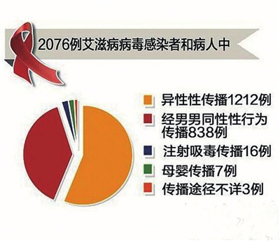 武汉市疾控中心党委书记周旺介绍,男男性行为已成为艾滋病感染的重要途径。今年1—10月,该市新报告常住居民艾滋病病毒感染者和病人596例,经性接触感染占97.3%,其中经男男同性性接触感染占64.8%。而在青少年艾滋病感染群体中,男男性行为感染的形势更为严峻。