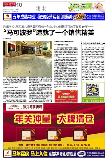 马可波罗磁砖砖,企业创立于1988年,品牌诞生于1996年。作为国内最早品牌化、产品系列最全最大的建陶品牌,是多家设计院战略合作品牌及奥运亚运世博会等大型工程建设的主要建材供应品牌。2013年品牌价值达到84.55亿,位列建陶行业第一,2014年以120.25亿,蝉联行业品牌榜单之首。