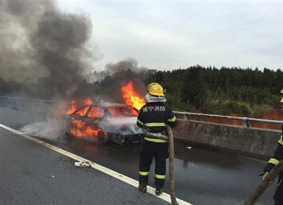本报讯 (记者 张仰强 通讯员 杨明 张异飞)12月6日15时许,京珠高速武汉往长沙方向1249公里处一辆轿车着火,情况十分危急。接警后,消防官兵迅速赶往事故现场处置。