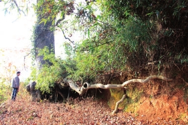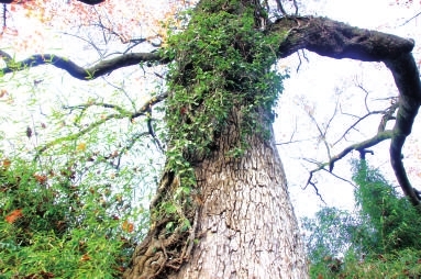 眼前的这株树龄280年,树高13米,胸围2.5米的枫香古树曲干虬枝,苍老遒劲,几根绿藤沿树干盘缠而上,传递着一种历经风雨的生命力。而古树盘根错节,造型奇特,一条树根沿山边蜿蜒而去,彰显着一种不畏风霜的沧桑美。