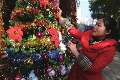 一年一度的圣诞节即将来临,昨日,记者在市区多家鲜花店看到,有关圣诞的饰品开始热销,圣诞帽、鹿角、圣诞树、铃铛应有尽有,街头到处洋溢着圣诞气氛。 赵忠志/摄