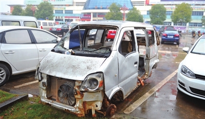 记者在现场看到,该面包车的车牌已不翼而飞,车身破损不堪,4个车轮也被人拆卸走。