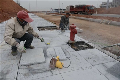 昨日,记者在咸宁大道东延伸线看到,工人们正在铺装人行道。