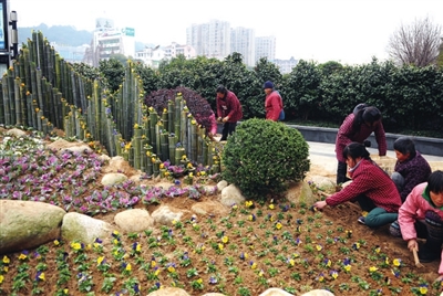 近日,记者在市区看到,为了迎接元旦的到来,园林工人在城区主干道景观点摆放各种鲜花植物和别致漂亮的景观装饰,让城市变得更加靓丽。图为园林工人正在新二号桥景观点摆放植物。 方达星/摄