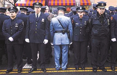 遇害华裔警察刘文健的葬礼4日在纽约布鲁克林区万寿殡仪馆举行。当天上午,纽约市长比尔·德布拉西奥在万寿殡仪馆内的葬礼仪式上发表演讲,颂扬警探刘文健。《纽约邮报》发布的一张图片显示,当殡仪馆外巨大的电子屏幕上出现纽约市长时,数千名身着蓝色制服的警察再次转过身,背对屏幕,以示抗议。