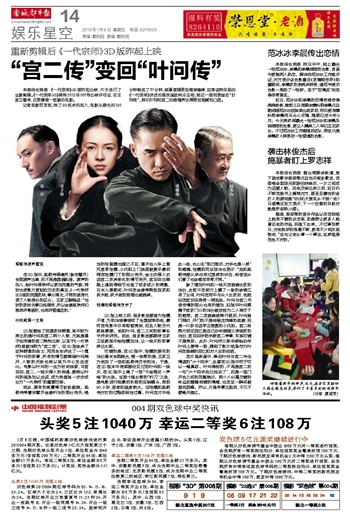 本报综合消息 《一代宗师》3D版昨起公映,片子进行了全新剪辑。《一代宗师3D》拥有2015年001号公映许可证,在王家卫看来,这更像是一部新的电影。