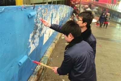 昨日,市城管部门组织人员走上市区主要干道,对沿街建筑物、公用设施上乱张贴、乱喷涂的“牛皮癣”进行集中清理。维护城市环境的整洁的同时,城管部门呼吁市民对非法乱贴小广告行为进行监督举报。