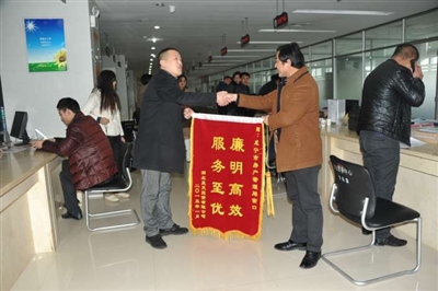 像这样送上门的锦旗,市政务服务中心市房产局窗口收到过不少。市政务服务中心市房产局窗口负责人王占华称,为了提高窗口工作人员的服务效率和服务热情,市房产局“软硬”兼施。硬件上,安排专项资金对房产档案进行数字化扫描,并与窗口进行对接,档案信息化大大提高了办事效率;软件上,成立督导小组,不定时监督、检查窗口,规范细化业务流程,开展了延时服务、上门服务、绿色通道服务等便民服务。