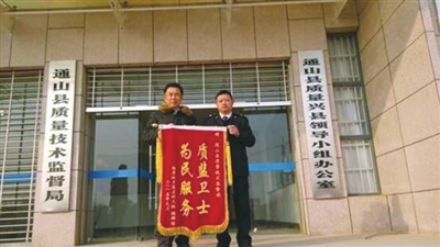21日下午,通山县杨芳林乡遂庄村三组村民给该县质监局稽查分局送来“质监卫士为民服务”锦旗,对该局执法人员的高效服务表示感谢。