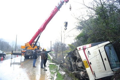 “好了,起吊!”现场6辆施救工程车辆中有3台吊车正在作业,准备将翻倒的客车和水泥槽罐车吊上路边。记者看到,客车车厢出现了一定程度的变形,车玻璃几乎全部破碎;巨大的水泥槽罐车侧翻在路旁,车上装载的物品并没有明显的泄露现象。