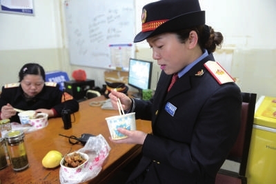 12点32分,送走这一车旅客之后,夏元芝才有空吃中饭。回到办公室时,盒饭已经冷了,夏元芝简单吃几口,又开始了工作。因为春运旅客多,每一个工作人员都需要加班加点,咸宁火车站每天停靠35趟列车,一天平均发送2500人,每年夏元芝和同事要接4200趟列车,护送上百万名旅客安全出行。
