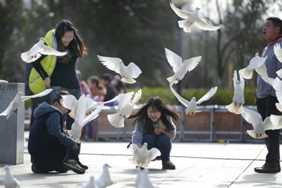 昨日,我市天气晴好,市民们纷纷走出户外,在市人民广场喂鸽子、放风筝、赏花,感受春天的气息。