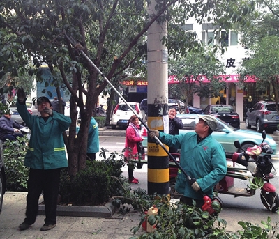 本报讯(记者毛亚轩)3日上午,记者在城区温泉路看到,5名园林工人正在对道路两旁的行道树进行树枝修剪,在剪除枯枝、病枝的同时,也将2米高度以下的岔枝除去。