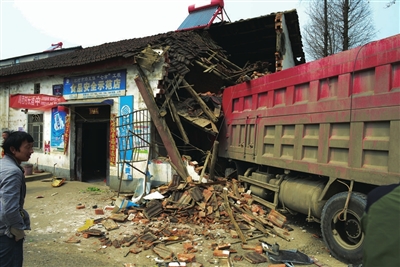 本报讯(记者 赵骥 张仰强)昨日上午11时许,有市民拨打本报热线电话报料称,107国道官塘段,一辆后八轮大货车失控冲进路边的民房,将路边的民房撞垮了半边。