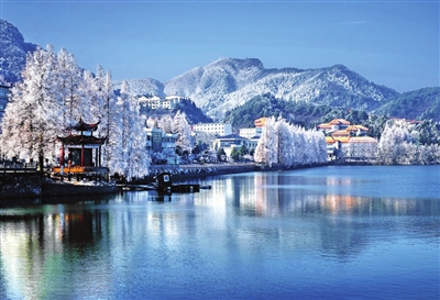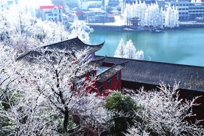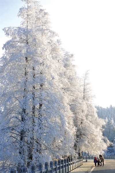 凛冽寒流袭卷九宫,雾凇在酷寒中盛开,盎然怒放如高山雪莲,凌霜傲雪,美丽皎洁,晶莹透亮。