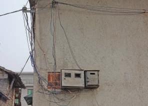王义军家的电表装在大门外,铁皮电表箱锈迹斑斑,联接电杆和表箱的是七八根乱七八糟的铝线。