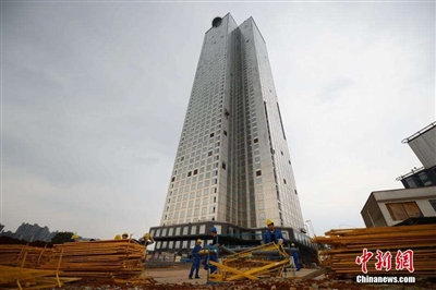 这栋名为“小天城”的57层高楼,由湖南远大可建公司建造。据介绍,楼高200多米,建筑面积18万平方米,包括3.6公里的步行街、19个10米高的大厅,可容纳4000人的工作场所及800户住宅。目前,大楼已完成主体封顶,转入墙体及内部装修阶段。
