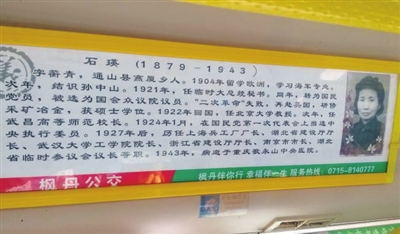 昨日上午,记者在1路公交车厢内,看到了石瑛的生平简介上附带着一张女性的照片(如图)。记者查阅了历史资料发现,确实如秦女士所说,该简介与照片张冠李戴。