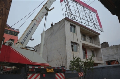 24日,市城管执法局综合执法二大队组织人员和吊车,对西外环和咸宁火车站附近三处民房楼顶上的违建户外广告牌,依法进行了拆除。该大队负责人表示,下一步将继续加大对永安城区违建户外广告牌的整治力度,对于违法建设的户外广告牌发现一起,拆除一起。 (周阳廖伟陈厚润)