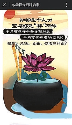 这是广东韶关东华禅寺3月27日在微信朋友圈中发布的招聘广告中的一段文字。该广告用悠扬的乐曲、有趣的漫画背景和生动活泼的招聘语言,发出8个岗位的邀请,其中包括APP运营专员、UI设计师、新媒体传播员、IT维护员等。