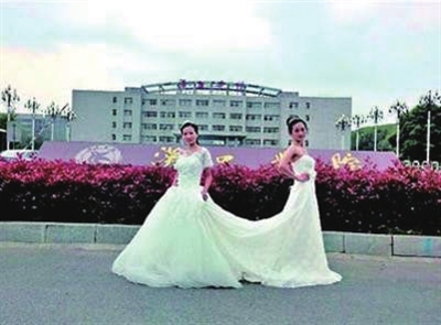 近日,汉口学院的大四学生小曾和小吴,在网上上传了一组婚纱毕业照。小曾觉得在母校拍婚纱照很浪漫,在即将毕业之时,与闺蜜一起在校园里,拍摄了这组特别的毕业照留作纪念。 (荆楚网)