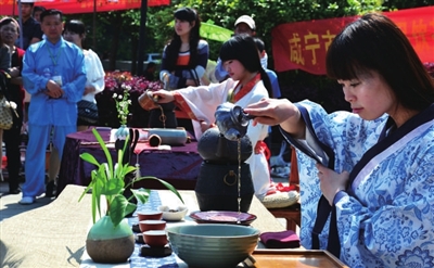 本报讯(记者郑璐)26日上午,由我市陆羽茶文化研究会主办的2015年咸宁市全民饮茶日活动启动仪式在潜山广场举行。启动仪式上,古典优雅的茶艺表演、柔和唯美的瑜伽术、刚柔并茂的太乙拳等节目博得市民的阵阵鼓掌喝彩。