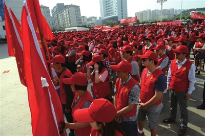 4月28日上午,在嘉鱼县政府广场,来自县直的1000余名党员干部头戴“小红帽”、身穿“红马甲”庄严宣誓,志愿加入“嘉鱼义工·党员先锋”队,随后,千名“红马甲”分赴各社区、学校、福利院等地开展保洁、义诊、安全用药咨询、电路检修、文体辅导、看望困难户(困难学生、孤寡老人)等示范服务活动,“红马甲”成为嘉鱼街头靓丽一景。