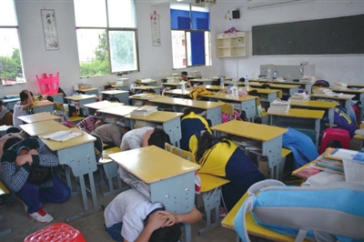 “呜呜……”随着地震警报拉响,学生们在老师指挥下,用书包保护头部,迅速躲到课桌下进行室内避灾…… 5月12日是防灾减灾日,市减灾委走进温泉岔路口中学,开展了一场避震疏散应急演练。庞赟向红梅/摄
