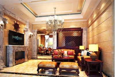 一般欧式客厅顶部都喜用大型灯池,并用华丽的枝形吊灯营造气氛,孙先生家也不例外。门窗上半部多用大理石做包边装饰,并用带有花纹的石膏线勾边。深色的枫木家具,色彩鲜艳的布艺沙发,这些都是孙先生家客厅里的主角。还有精美的油画,制作精良的雕塑工艺品,这些工艺品都让孙先生家尽显华美的气息。