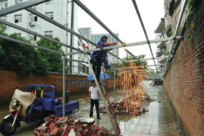 14日上午9时许,记者在小区出行通道处看见,虽然下着小雨,但来自咸安区城乡管理执法局温泉中队和咸安区温泉办事处的20余名工作人员来到现场,对出行通道上搭起的违建大棚进行拆除,还道于民。