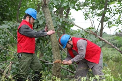 5月中旬,嘉鱼县供电公司辖区线路通道内的超高树木、树障进行集中清理,确保电网安全。图为党员服务队队员在高铁镇白果树村清障。熊华芳杜芳/摄