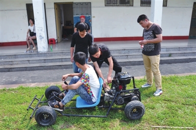 焊接起简易的框架、搭载破旧的摩托车发动机、装上钢质方向盘、配上轮胎,便制成了一辆卡丁车。再加上一小瓶汽油,坐上去,轻踩简易油门,卡丁车就能在路面上“呼呼”飞驰。