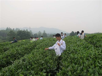 当天早上7点30分,寄宿部参加活动的同学们准时集合出发。赶到茶园后,同学们非常兴奋,在工作人员现场培训采茶技术后,领着篮子就“扑”向了一大片翠绿的茶园中。同学们按班级分小组合作的方式进行采茶,每个小组有一个组长、七到八个组员。“看,我们组已经采了这些了。”“我们组也采了很多了。”同学们在采茶的同时,还不时地炫耀各自的“战果”。对于这些从小生活在城市,从没有见过茶树、到过茶园的学生们来说,采茶仅仅是生活体验;对于老师所介绍的采茶勤工俭学的经历,同学们感慨如今的校园生活是多么幸福。