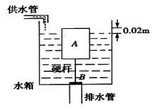 如图是某课外科技小组的同学设计的厕所自动冲水装置的示意图,它在自来水管持续供给的较小量的水储备到一定量后,自动开启放水阀门,冲洗厕所。实心圆柱体浮体A的质量为5.6kg,高为0.18m,阀门B的面积为7.5×10-3m2;连接A、B的是体积和质量都不计的硬杆,长为0.16m。当浮体A露出水面的高度只有0.02m时,阀门B恰好被打开,水箱中的水通过排水管开始排出。已知水的密度为1×103kg/m3,不计阀门B的质量和厚度。当水箱开始排水时,求: