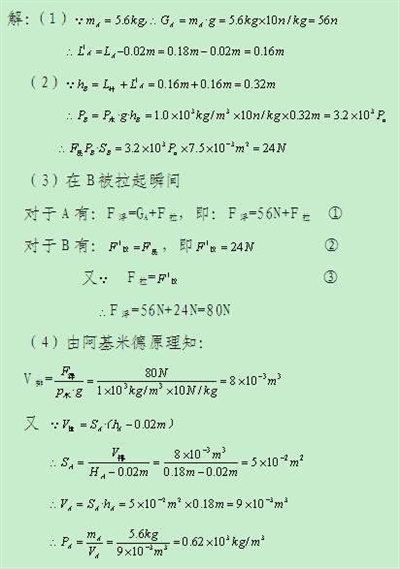 求出浮体A浸在液体中的那部分体积V排,方法是运用阿基米德原理:F浮=p液·V排g,求出V排,又因为V排=SA(hA-0.02m),求出SA,所以VA=SA·hA,最后,求出浮体A的密度,pA=,最后同学们解物理综合题时,一定要注意问题的规范,下面就是规范的答题供同学们参考。