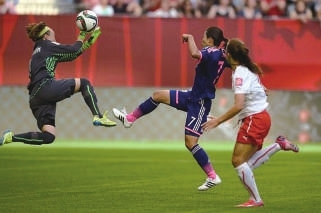 日本队的努力在第29分钟得到回报。当时日本队队员安藤梢杀入禁区,她接到队友大仪见优季的传球后挑射,此时瑞士队门将塔尔曼出击,两人撞在一起,裁判不仅对塔尔曼出示了黄牌,而且判罚点球。宫间绫主罚一蹴而就,日本队1:0领先。