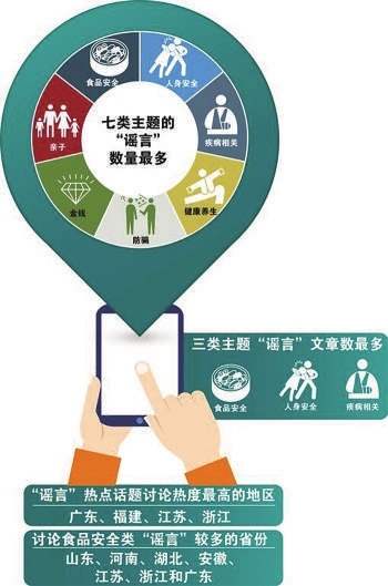 一份报告对2014年11月3日至2015年2月28日微信中被多人举报为“诈骗和虚假信息”的625篇文章共17周数据进行了分析。研究发现,七类主题的“谣言”数量最多:食品安全、人身安全、疾病相关、健康养生、防骗、金钱、亲子。其中,食品安全类、人身安全类、疾病相关类主题的“谣言”文章占了“谣言”文章总数的大部分。
