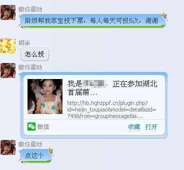 和王女士的经历差不多,还有公司职员小陈,她说差不多每天打开微信、QQ总有帮忙投票的信息或者链接。“一些朋友会在朋友圈群发投票请求,大多是给孩子投票。”小陈表示,自己还是单身没小孩,发这些信息的大多是自己的客户或潜在客户。为了拉近与客户的关系,她都会关注并在微信转发,帮客户拉票。“没办法,投一两次票还可以,弄多了,很多朋友都挤兑我是专业‘拉票党’。”小陈说,为此自己很无奈,虽然不乐意,但还是得投票。