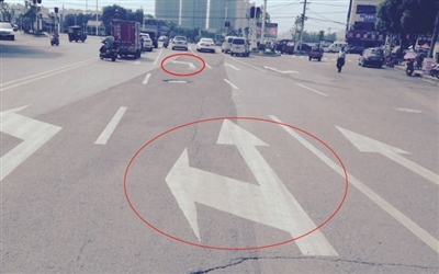 昨日上午,记者来到现场看到,宝塔大道红绿灯附近(往西外环方向)的马路上有三条提示方向路标,中间一条显示为左转和直行车道,而靠近红绿灯处显示是的只能左转的车道(如图)。