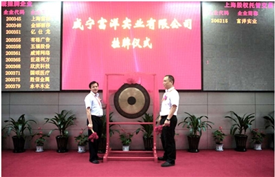 7月10日,咸宁富洋实业有限公司在上海股权托管交易中心成功举行Q板挂牌仪式,成为我市首家在沪挂牌企业。 (记者原子 通讯员熊松)